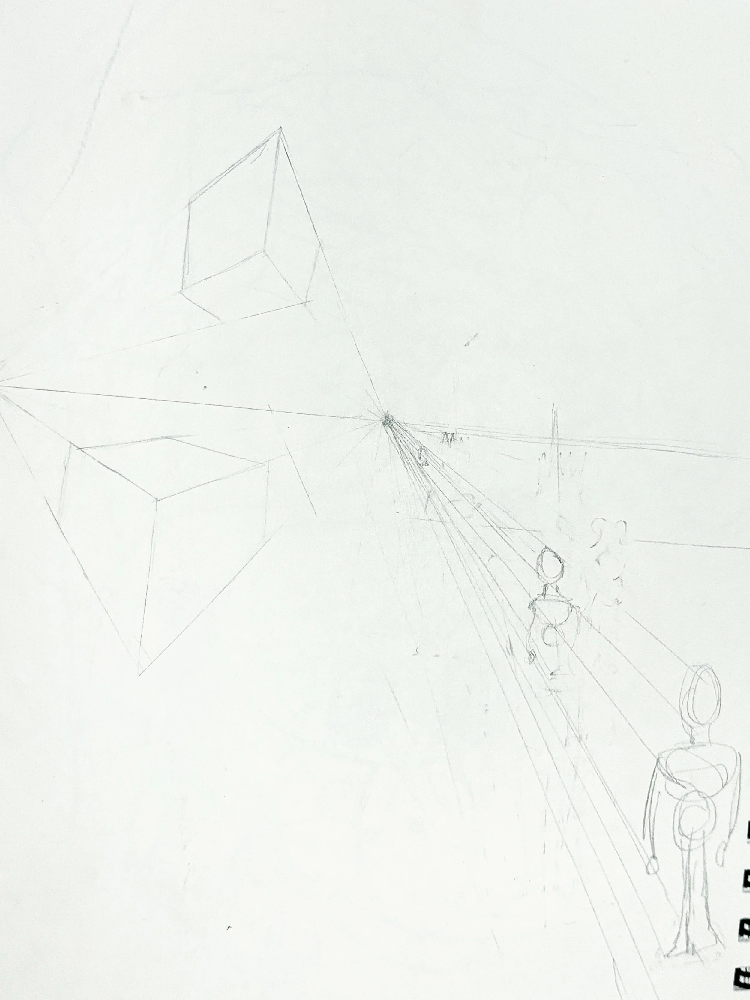 This is just practice of 1 point perspective, so I am aware that my little man looks like an alien, and I am very content with his dorito-esque stature.